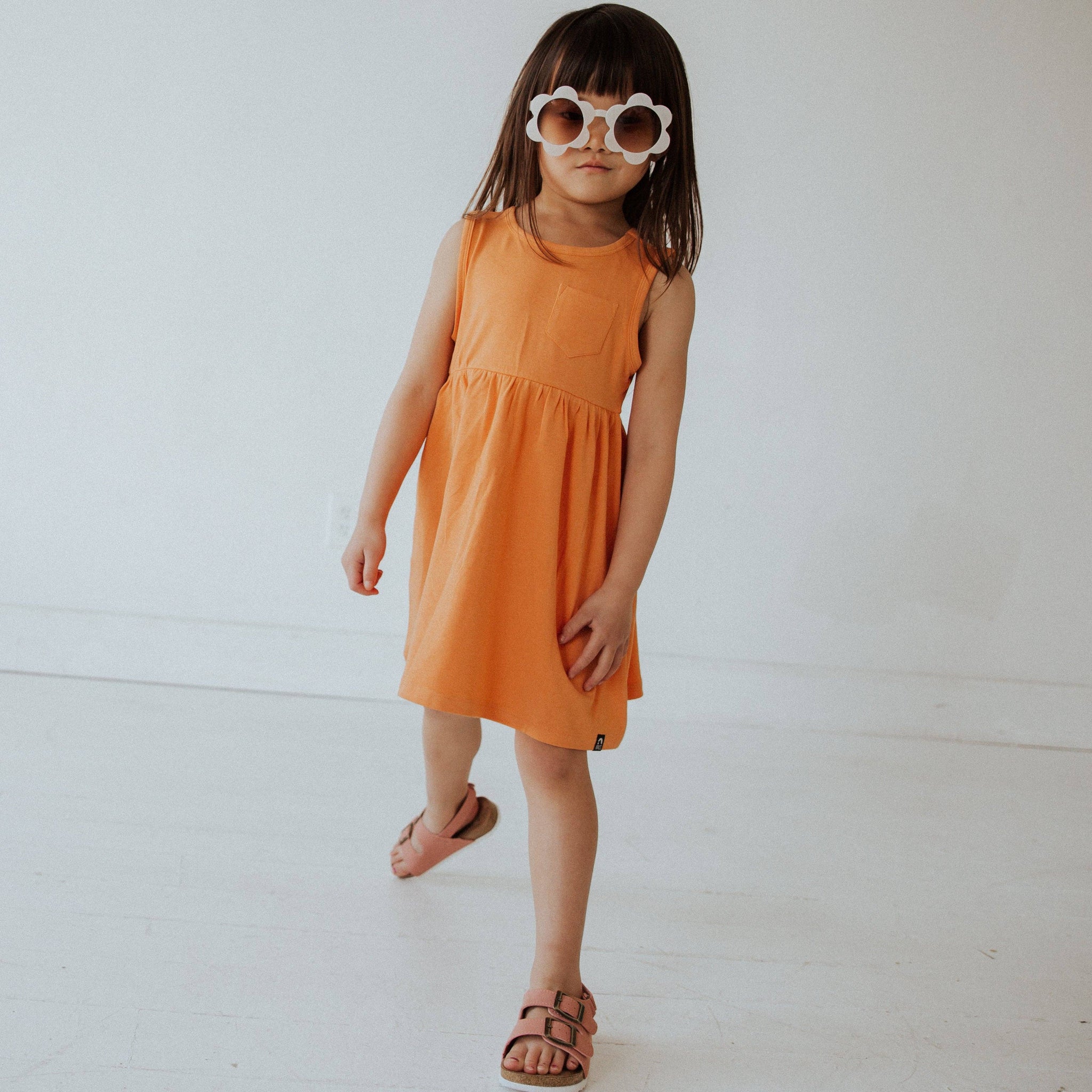 This new sleeveless style and relaxed fit is perfectly cool and essential for Summer to Fall. The Essentials Tank Dress features a casual fit that flatters your growing girl, and includes a chest pocket, perfect for stashing tiny treasures. Made with our signature super-soft, premium modal blend fabric and available in soft and neutral colors that coordinate with Essentials tees and rompers. Now the whole family can match and still look and feel cool. Layer with a cardigan and nail that Summer-to-Fall transition. Your babies, toddlers, and kids will fall in love with these dresses. Available in 3-6M to 11/12Y.