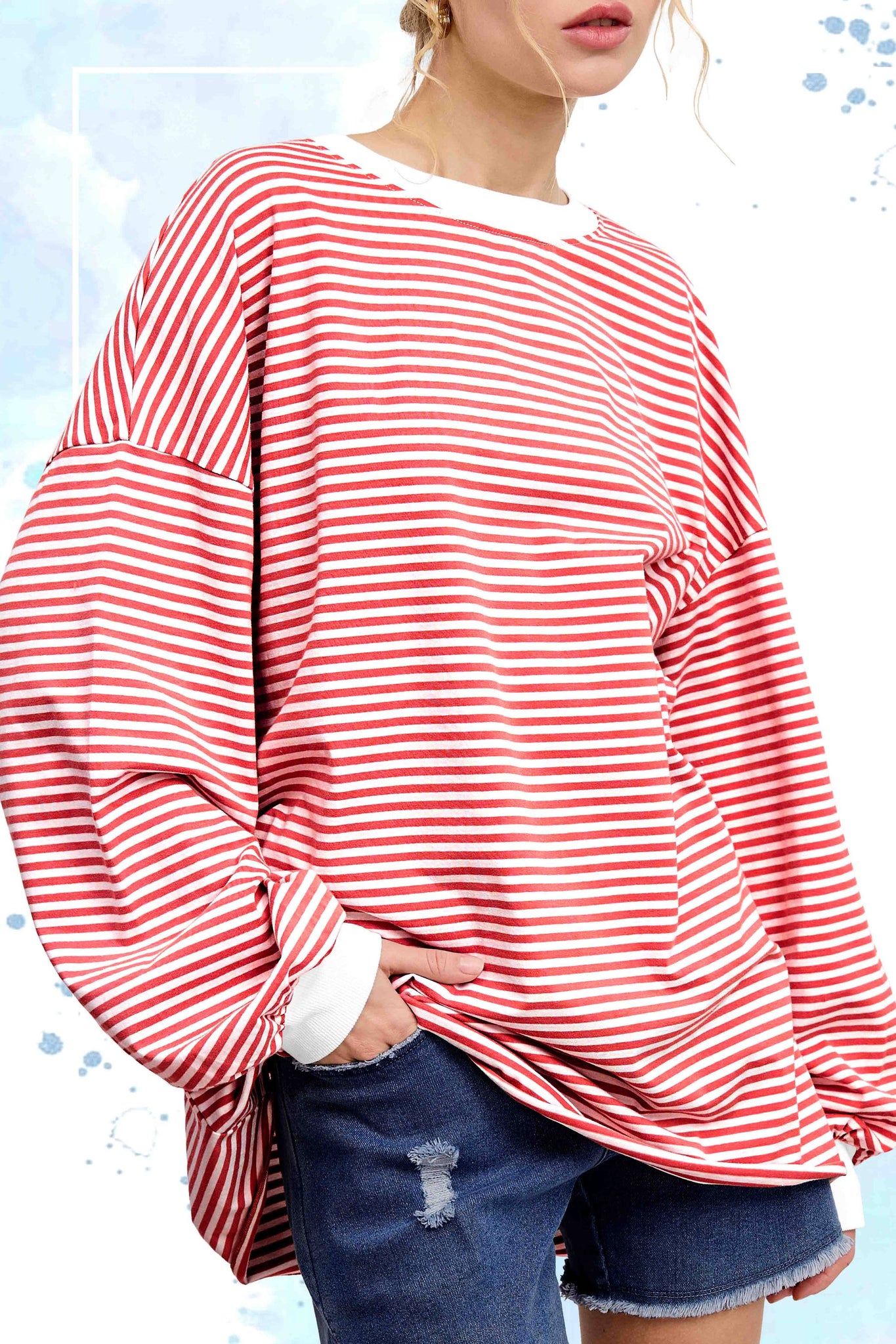 So cool and classic, this timeless crewneck top is featured in an oversized, ballon sleeves, slouchy silhouette and staple striped print.